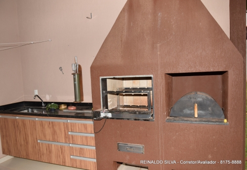 - Churrasqueira com gira grill, forno, piso em porcelanato, amplavaranda coberta para mesas e cadeiras.