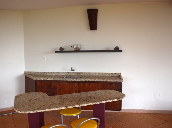 Churrasqueira externa, coberta, amplo espaço para mesas.